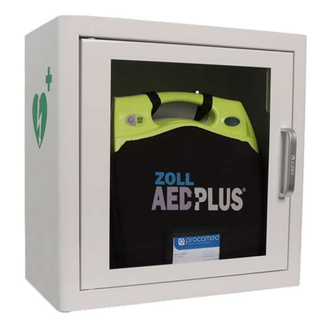 Weisser CompactCase Wandkasten zur Innenmontage für Defibrillatoren wie ZOLL AED Plus, AED 3 oder AED Pro. Ohne Alarm, aus Stahl mit Sichtfenster. Aussenmasse (BxHxT) ca. 38 x 38 x 20 cm.